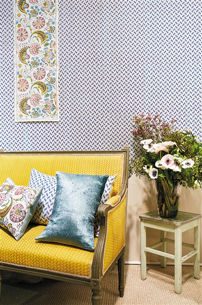 如果黄色回归乡村,首先让人想到的是成熟小麦,或是大地的颜色。在乡村家居风格中,黄色没有那么明艳却多了一丝俏皮。复古的沙发椅采用了黄色面料,靠包选择了蓝色丝绒以及墙面同款图案。沙发椅旁边的旧凳子上摆放着鲜花,悠闲乡村气质立刻浮现。
