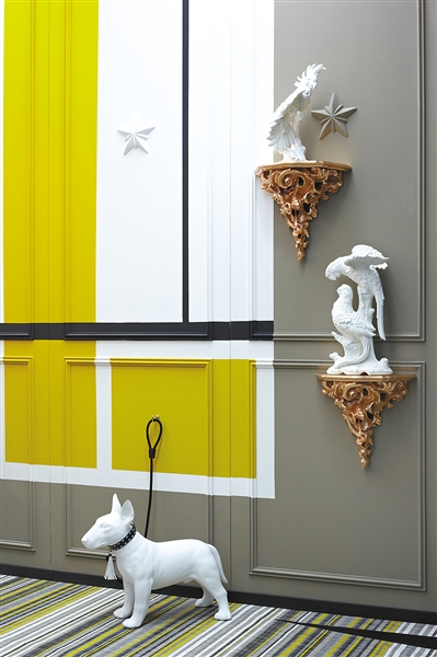 黄色除了俏皮、活力外,近年来也在时装T台比较流行,带来时尚的感觉。当黄色出现在墙面时,和白色、黑色、灰色的搭配显得特别突出。复古式的法式墙面并没有采用常规的装饰手法,而是在灰色基础上,巧妙地设计了不规则的黄色、白色和黑色的色块组合。彩色的条纹地毯、白色装饰品突出了空间的艺术氛围,而一只惟妙惟肖的装饰狗则把时尚的气息加入其中,也让整个空间“小资”起来。